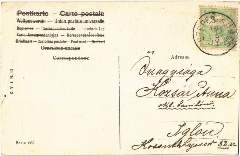 Leírás: 1905 Boldog Újévet! / New Year greeting art postcard, lady with pigs, horseshoe and clovers. K.V.I.B. 12. Serie 685. (EK)