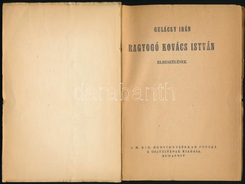 Leírás: Gulácsy Irén: Ragyogó Kovács István. Bp., é.n., M. Kir. Honvédvezérkar főnöke 6. osztálya. Kiadói papír kötés, kopottas állapotban, benne szakadt lappal.