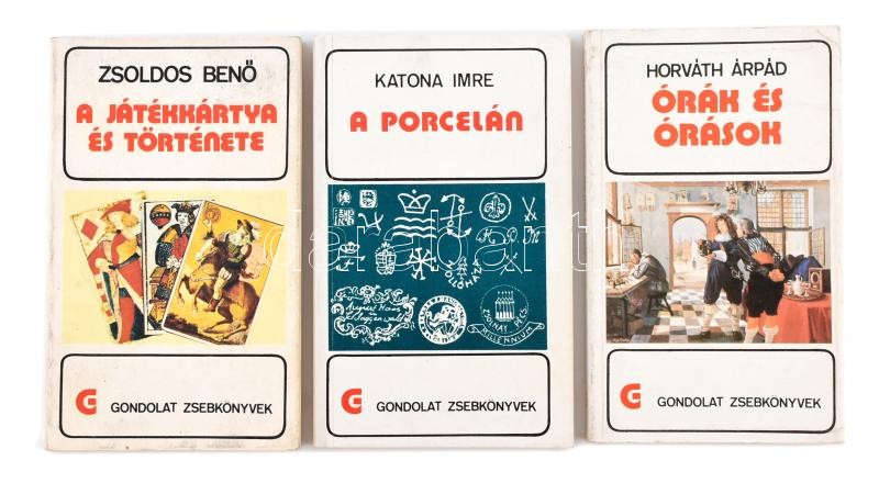 Vegyes Gondolat Zsebkönyvek könyvtétel, 3 db. Katona Imre: A porcelán. Bp, 1984. Gondolat. Papírkötésben, jó állapotban. + Horváth Árpád: Órák és órások. Bp, 1982, Gondolat. Papírkötésben, jó állapotban. + Zsoldos Benő: A játékkártya és története. Bp., 1980, Gondolat. Papírkötésben, jó állapotban, tulajdonosi névbejegyzéssel.