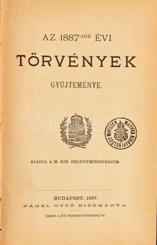Az 1887-dik évi törvények gyűjteménye. Bp., 1887, Nágel Ottó, Pesti Könyvnyomda Rt. -ny., XXIII+392 p. Első kiadás. A címlapon "Magyar Királyi Belügy Minister" bélyegzéssel. Átkötött félvászon-kötés, kopott borítóval, a gerincen kis sérüléssel.