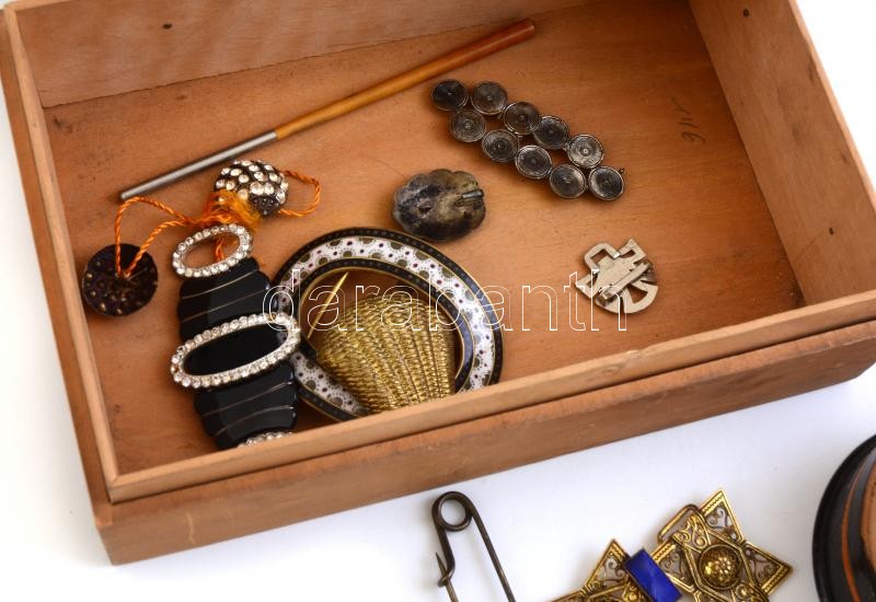 Leírás: Vegyes bizsu tétel, régi darabokkal, fa Kugler Henrik Gerbeaud dobozban. 24x15 cm