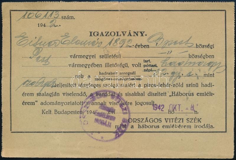 Leírás: 1942 Országos Vitézi Szék által kiállított háborús emlékérem viselésére jogosító igazolvány