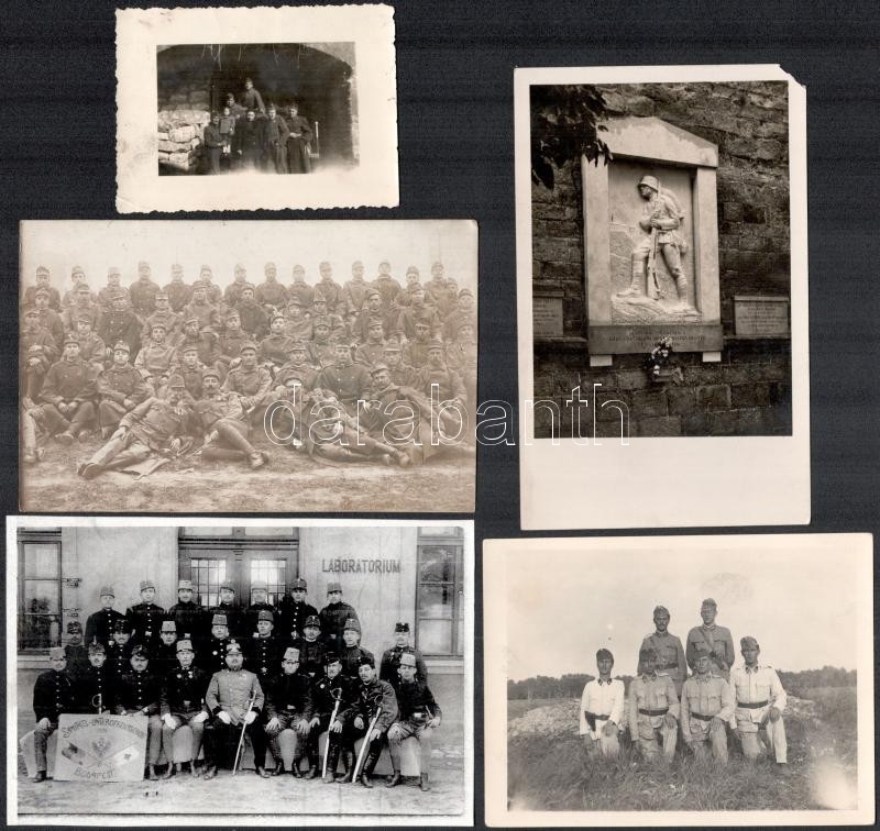 Leírás: cca 1914-1940 5 db vegyes katonai fotó, közte egy modern előívás, sarokhiány, felületi törésnyom, 8,5×6 és 14×9 cm közötti méretekben