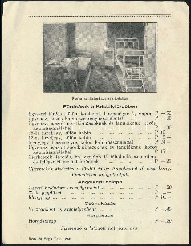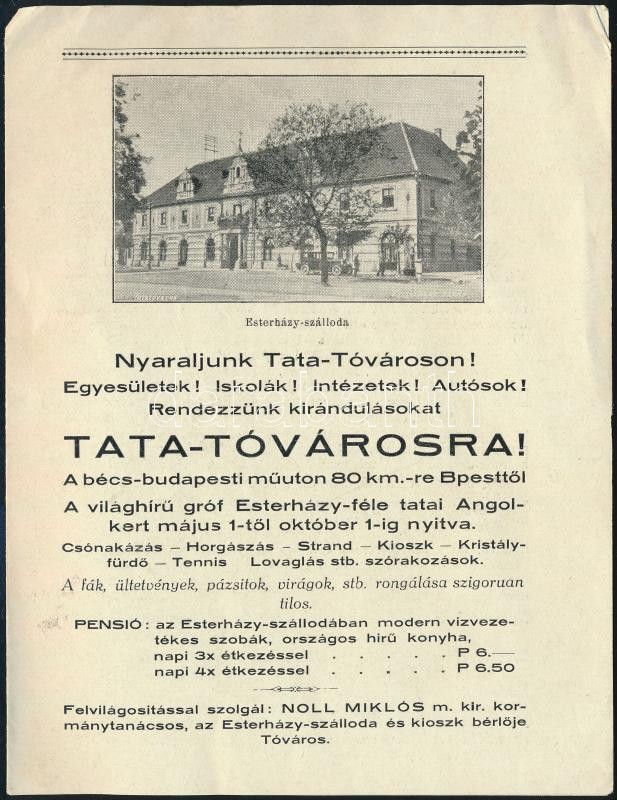 Leírás: 1931 Nyaraljunk Tata-Tóvároson! Egyesületek! Iskolák! Intézetek! Autósok! Rendezzünk kirándulásokat Tata-Tóvárosra! Reklám prospektus, fekete-fehér fotókkal. Tata, Hesz és Végh-ny., 2 sztl. lev, 15x11 cm.