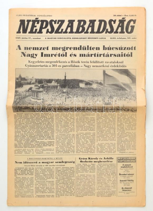 Leírás: 1989 Népszabadság. 1989. jún. 17., XLVII. évf. 141. sz. A címlapon: 'A nemzet megrendülten búcsúzott Nagy Imrétől és mártírtársaitól.'