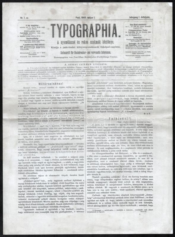 Leírás: cca 1969 A 100 éve megjelenő Typographia I. évfolyama 1. számának reprodukciója. Az Athenaeum Nyomda ofszetnyomása