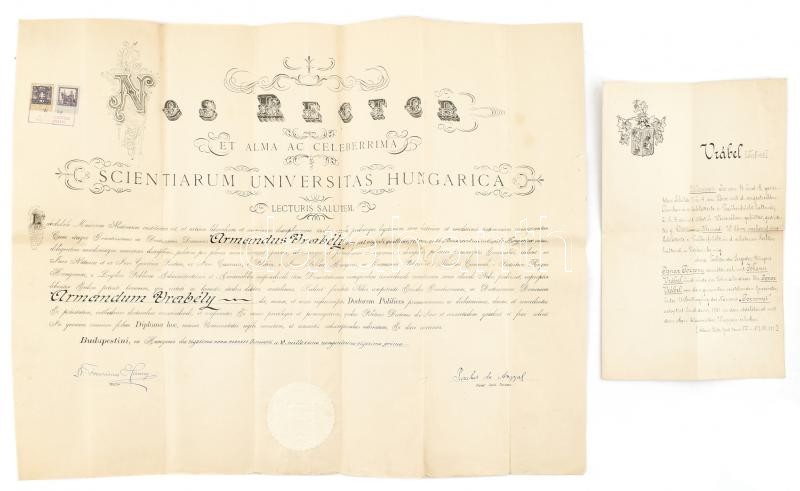 Leírás: cca 1900 A Vrábel család nemesség igazolásának másolata a családi címer rajzával valamint Vrabély Armand diplomája