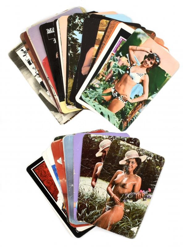 Leírás: Kb. 40 db , többségében erotikus kártyanaptár az 1980-as évekből, részben kopott és törésnyomokkal