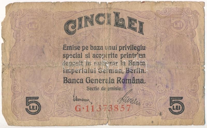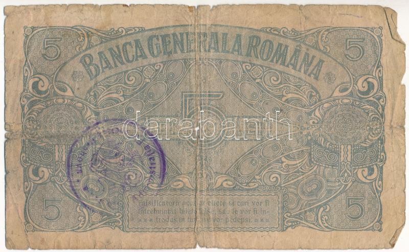 Románia / Német megszállás 1917. 5L rajta részben kiolvasható román nyelvű bélyegzés T:III- kis szakadások, hajtás találkozásánál ly.