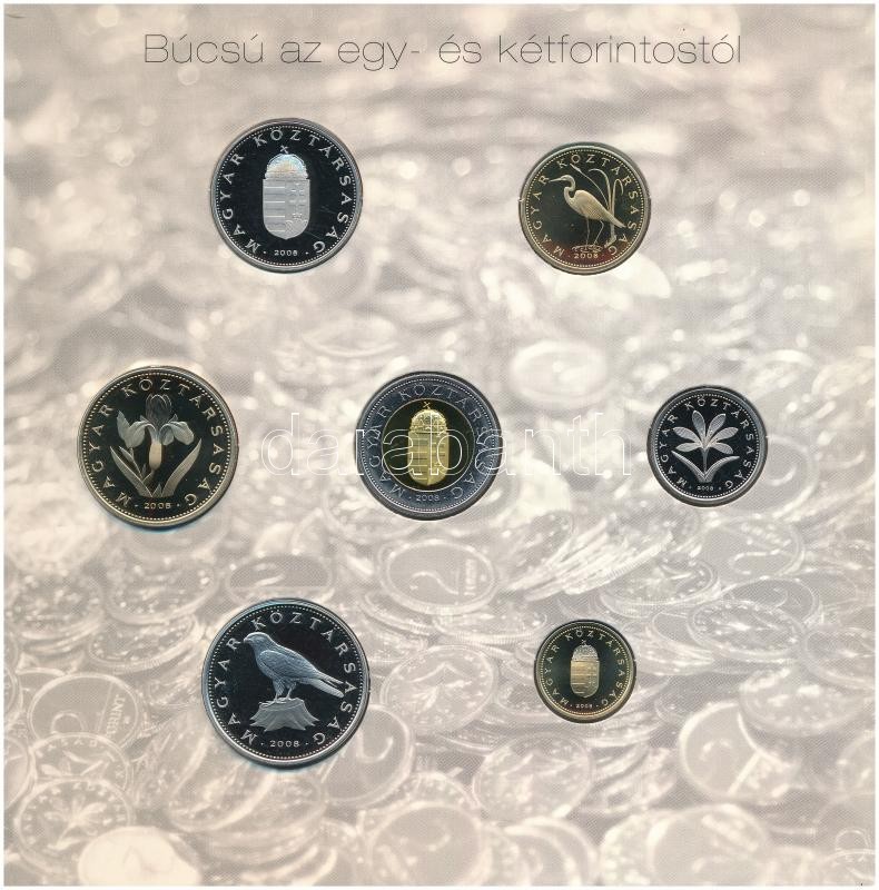 2008. 1Ft-100Ft (7xklf) darabos forgalmi sor "Búcsú az egy- és kétfori... https://www.darabanth.com/hu/387-Gyorsarveres/387.0/Numizmatika/Magyar-es-magyar-verdejelu-fem-es-ezustpenzek~1500021/2008-1Ft-100Ft-7xklf-darabos-forgalmi-sor-Bucsu-az-egy-es-ketforintostol-disztokos-szett~II2323040