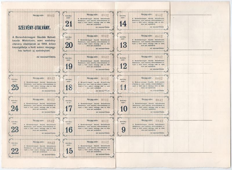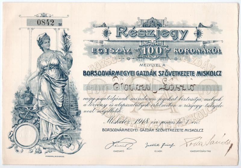 Leírás: Miskolc 1918. "Borsodvármegyei Gazdák Szövetkezete Miskolcz" névre szóló részjegye 100K-ról, szelvényekkel, szárazpecséttel T:I-