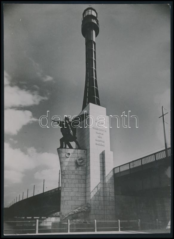 cca 1940 Budapest, a Haditengerészet emlékmű a Horthy hídon (egyúttal világítótorony is, későbbi Petőfi híd), 2 db fotó, jelzés nélkül, 6x4,5 cm és 23×17 cm