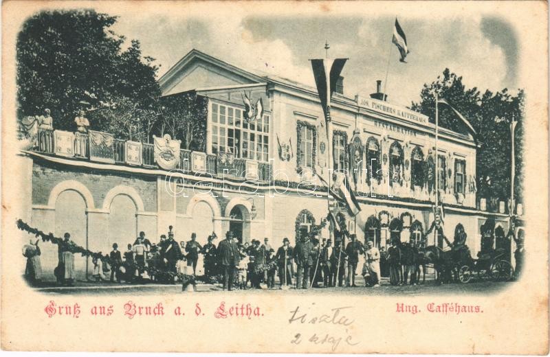 Lajtabruck, Bruck an der Leitha; Jos. Fischer's Ung. Kaffeehaus und Restauration / kávéház és étterem magyar zászlókkal és címerrel / Hungarian restaurant and cafe with coat of arms and flags (fl)