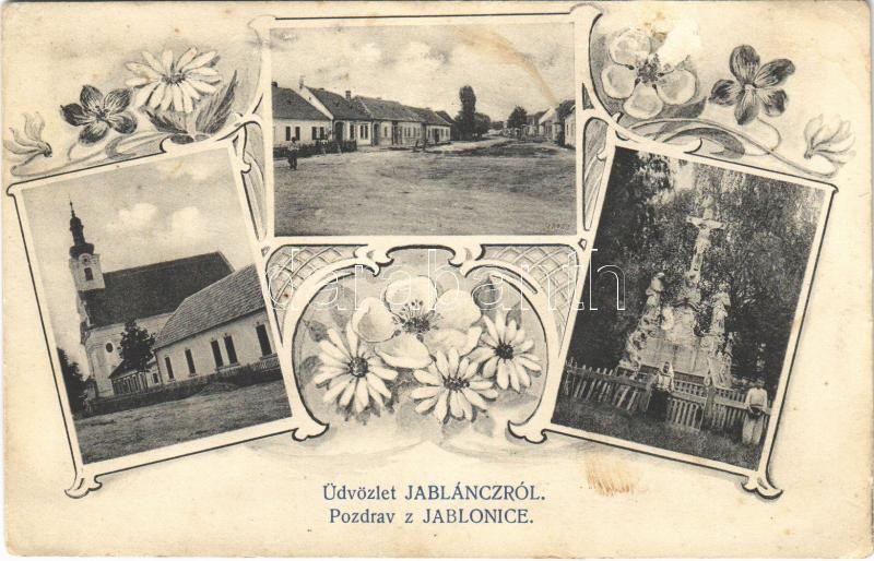 Leírás: Jablánc, Nyitra-Jablonic, Jablonica; utca, templom, Kálvária / street, church, calvary. Art Nouveau, floral (EK)