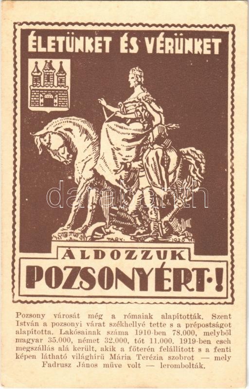 Pozsony, Pressburg, Bratislava; Életünket és vérünket áldozzuk Pozsonyért! irredenta képeslap a lerombolt Mária Terézia szoborral / Hungarian irredenta postcard about the destruction of the Maria Theresia statue s: Tary
