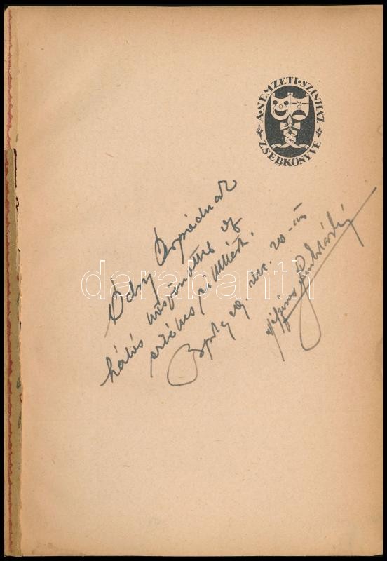 Mészáros Sándor László (szerk.): A Nemzeti Színház és Kamaraszínházának zsebkönyve. Első évfolyam. Mészáros Sándor László 1889-1972) színész, a könyv szerkesztője által Ódry Árpád (1876-1937) színész, színiakadémia színigazgatójának dedikált! Aranyozott emblémás, kiadói vászonkötésben, sérült borítóval, előzéklap és az a dedikált első lap sérült és kijár.