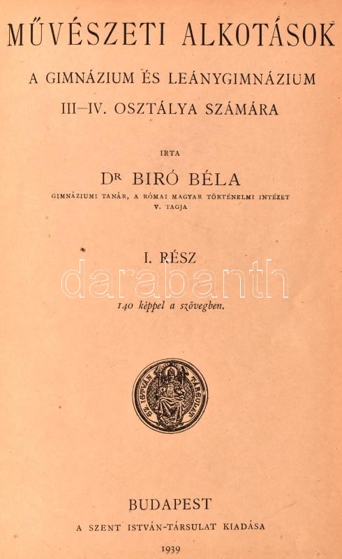 Bíró Béla: Művészeti alkotások a gimnázium és leánygimnázium III-IV. osztálya számára. I. rész. Bp., 1939, Szent István-Társulat, 119+1 p. Átkötött egészvászon-kötés. + Kónya József: Magyar műalkotások ismertetése. Gimnáziumok és leánygimnáziumok VIII. osztálya számára. Bp.,1942, Debrecen Sz. Kir. Város-Tiszántúli Református Egyházkerület Könyvnyomda-Vállalata. Kiadói papírkötés, kissé szakadt borítóval.