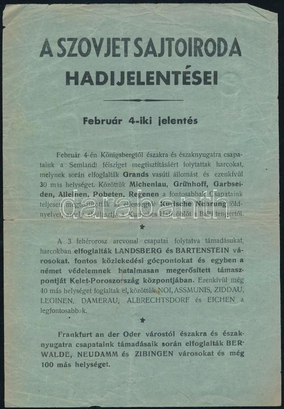 Leírás: cca 1945 A Szovjet Sajtóiroda hadijelentése Landsberg, Bartenstein stb. városok elfoglalásáról, szakadásokkal