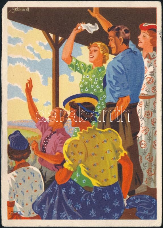 Leírás: 1940 Gönczi-Gebhardt Tibor (1902-1994): Indarthen ruhafestés reklámos képeslap, Bp., Klösz-ny., a sarkán kis sérüléssel, 15x10 cm