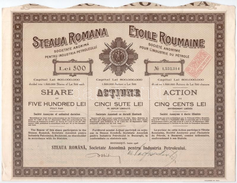 Románia / Bukarest 1926. "Steaua Romana" háromnyelvű részvén... https://www.darabanth.com/hu/388-Gyorsarveres/388.0/Numizmatika/Reszvenyek-es-sorsjegyek~2500005/Romania-Bukarest-1926-Steaua-Romana-haromnyelvu-reszveny-500L-rol-szelvenyekkel-felul~II2326589