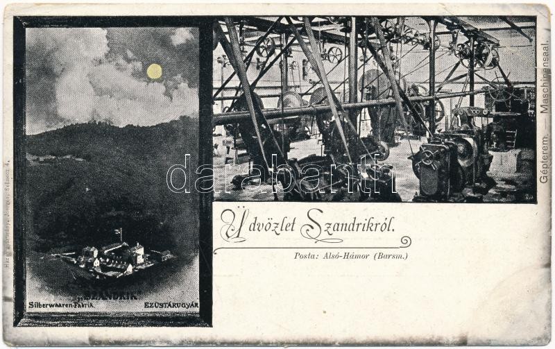 Alsóhámor, Dolné Hámre (Hodrushámor, Hodrusa-Hámre); Szandrik magyar ezüst és fémárugyár, este, gépterem belső. Hazai gyártmány Joerges 4. / silver and metalware factory, engine room interior, night (EB)