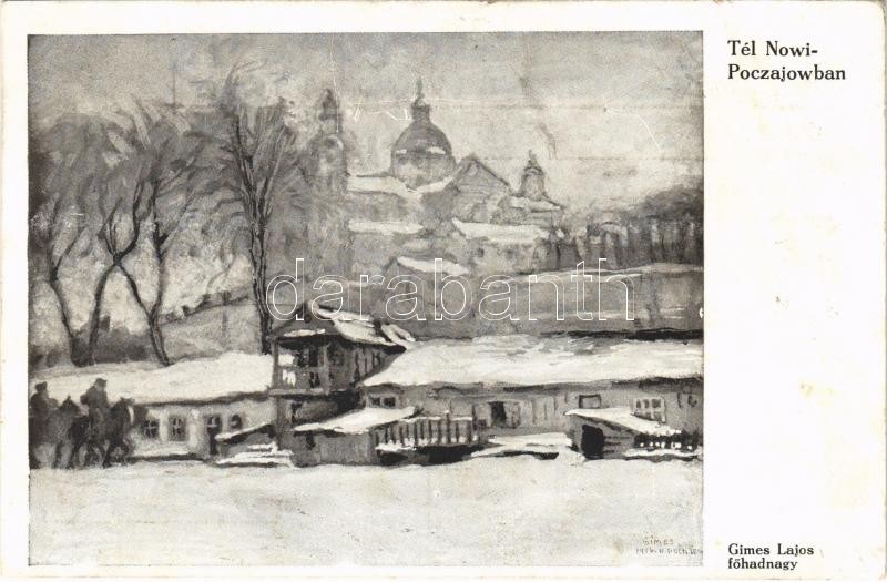Leírás: Tél Nowi-Poczajowban (Ukrajna). Tábori Postai Levelezőlap / WWI K.u.K. military art postcard, winter in Pochaiv, Pochayev (Ukraine) s: Gimes Lajos főhadnagy