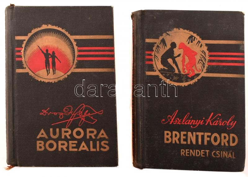 Nova Irodalmi Intézet 2 kiadványa: Drozdy Győző: Aurora Borealis. Államregény, de nem utópia.; Aszlányi Károly: Brentford rendet csinál. Bp., 1937, Nova. Kiadói aranyozott, festett egészvászon-kötés, kopott borítókkal, egy gerincen kis sérüléssel.