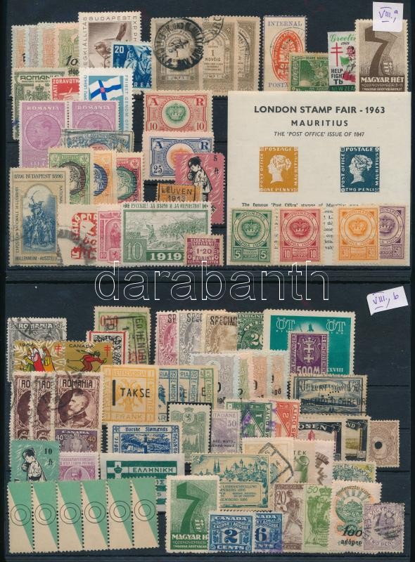 Leírás: 88 db parafilatélia, illetve okmány- és illetékbélyeg a világ minden tájáról, változatos anyag, 2 db stecklapon