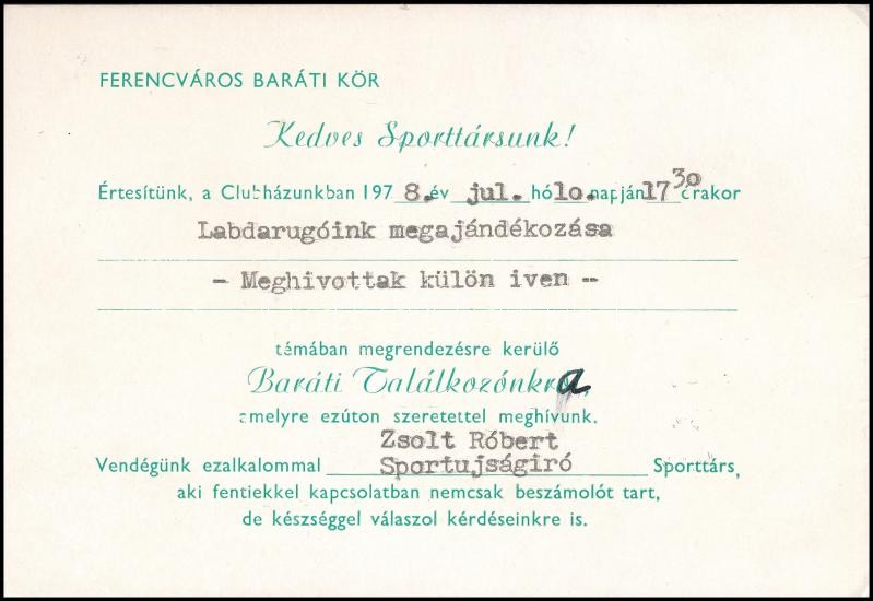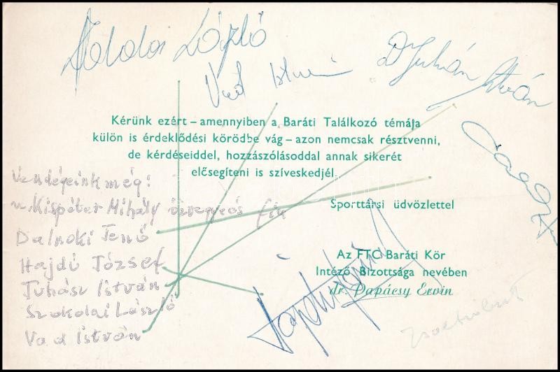 Leírás: FTC baráti kör meghívója aláírásokkal, pl. Juhász István, Vad István, stb.