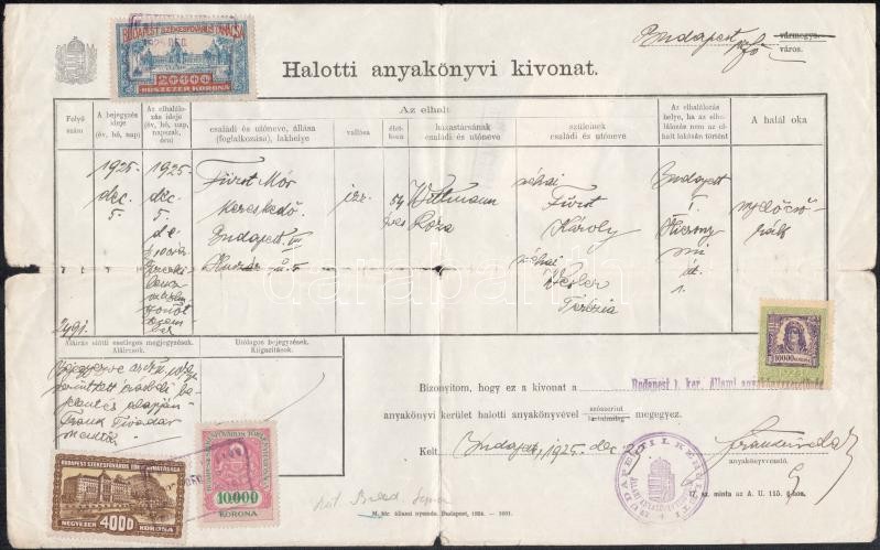 Leírás: 1925 Bp., Halotti anyakönyvi kivonat Fürst Mór izraelita vallású kereskedőről, okmánybélyegekkel