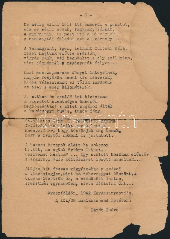 Leírás: 1942 Barát Endre (1907-1976) verstöredék az Oroszországban állomásozó 101/38-as munkásszázadról. Sérült gépirat.