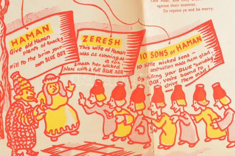 Leírás: cca 1948 Purim Jewish National Fund cionista propagnada plakát sérült./ Zionist propaganda poster. Damaged. 90x57 cm