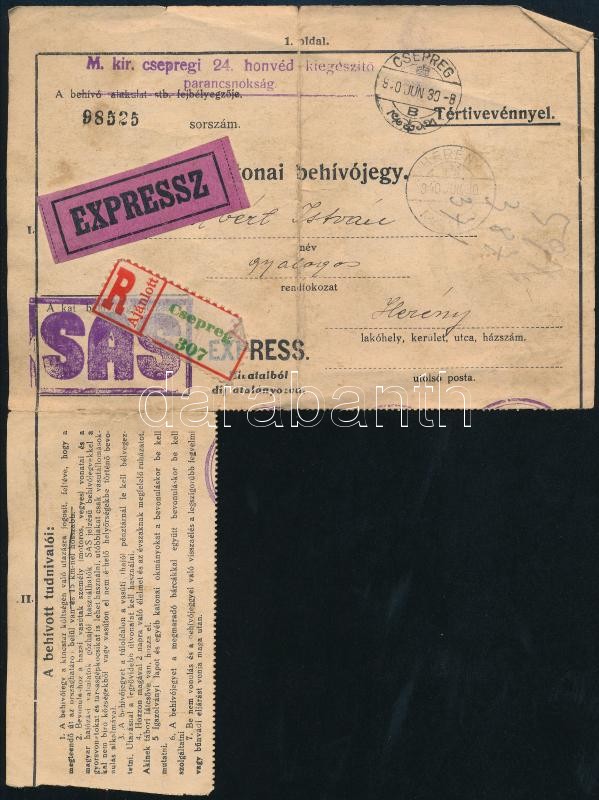 Leírás: 1940 Katonai behívó, Csepregről küldve, ajánlott, expressz küldemény