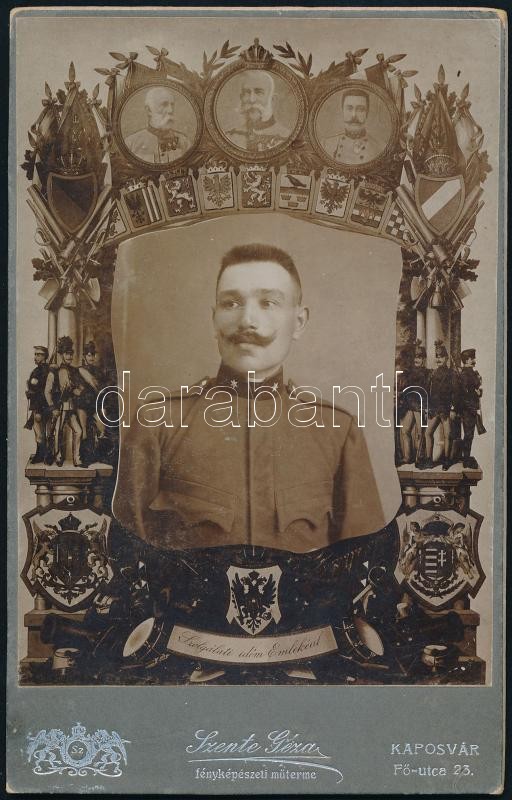 cca 1900 Katona fotója kartonon. Ferenc József, Ferenc Ferdinánd és a ... https://www.darabanth.com/hu/389-Gyorsarveres/389.0/Mutargy-papirregiseg-egyeb/Militaria~28/cca-1900-Katona-fotoja-kartonon-Ferenc-Jozsef-Ferenc-Ferdinand-es-a-cimerek-kepevel-10x17-c~II2340880