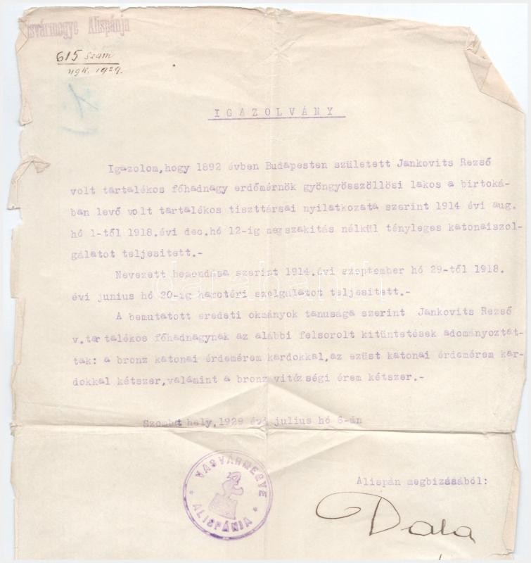 Leírás: 1929 Igazolvány hactéri szolgálatról és érdemrendek adományozásáról
