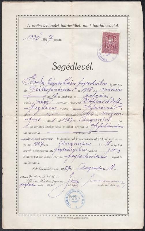 Leírás: 1927 Fogtechnikus segédlevél fogorvos aláírással