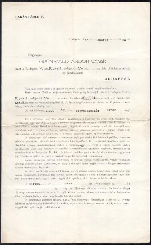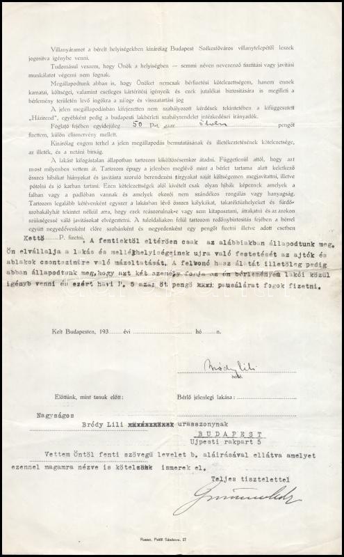 Leírás: 1933 Bródy Lili (1906-1962) költő, újságíró saját kézzel aláírt lakásbérleti szerződése