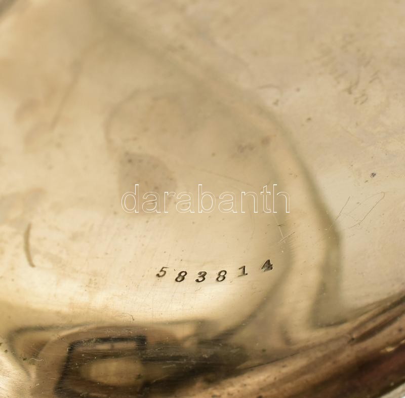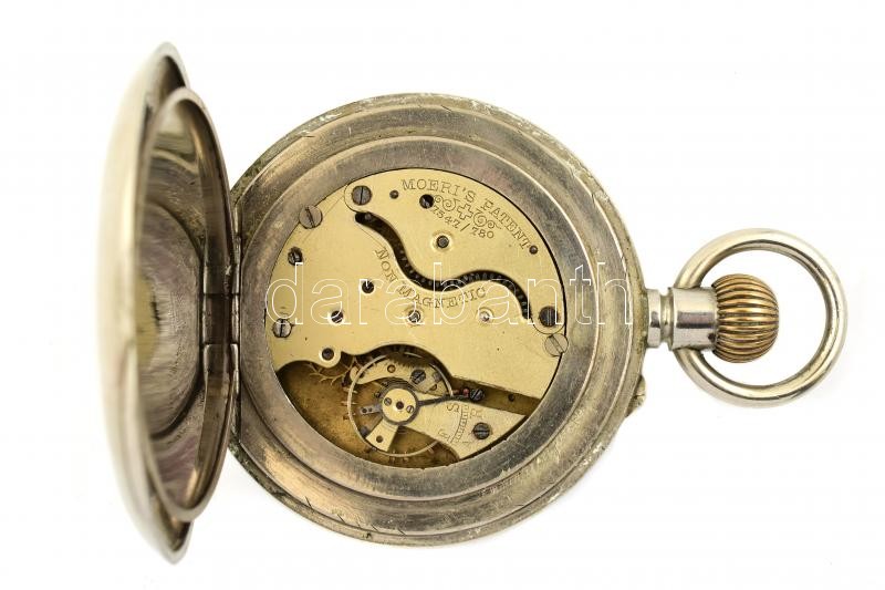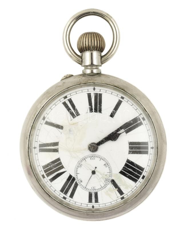 Leírás: Moeri angol 8 napos zsebóra. Fém tokos, jelzett szerkezettel, sérült számlappal, működő állapotban d: 65 mm