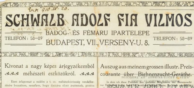 1910 Schwalb Adolf Fia Vilmos Bádog- és Fémáru Ipartelepének árjegyzéke. Kivonat a nagy képes árjegyzékemből méhészeti eszközökből. Bp., Spieler-ny., magyar és német nyelven, illusztrációkkal, hajtott, egy kisebb sérüléssel, 56x30 cm