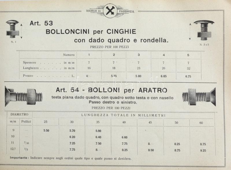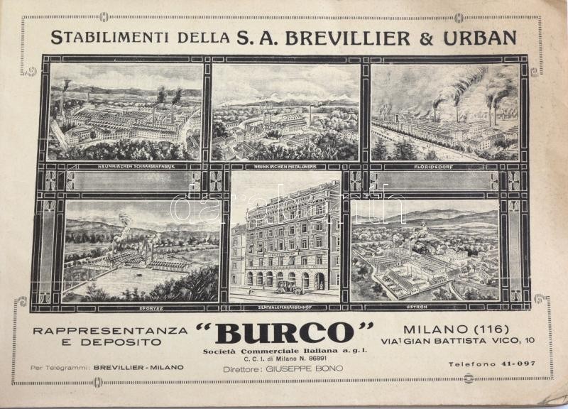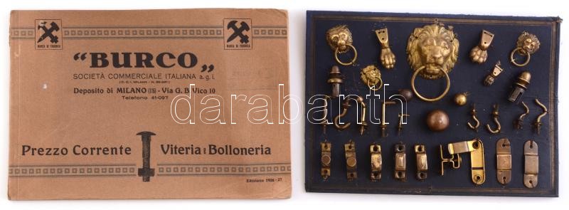 1926 Burco olasz rézárú gyár képes termékkatalógus cca 60p. + réz termék minták táblán. 24x17 cm / Burco Italian factory, product booklet + copper products on table.