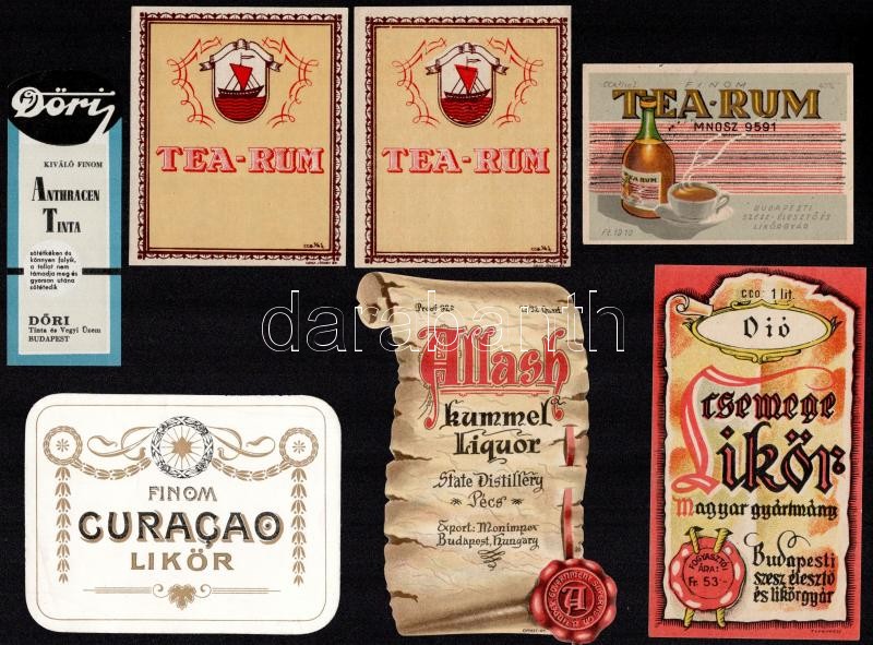 Leírás: 6 db vegyes italcímke, közte: Tea-rum, Allash stb + 1 db tintás címke