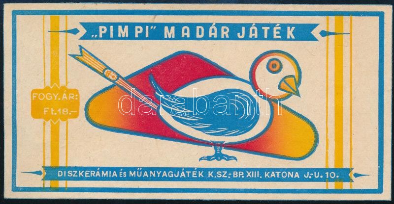 Díszkerámia és Műanyagjáték K.Sz. "Pimpi madárjáték címke" https://www.darabanth.com/hu/389-Gyorsarveres/389.0/Mutargy-papirregiseg-egyeb/Reklam~22/Diszkeramia-es-Muanyagjatek-KSz-Pimpi-madarjatek-cimke~II2341843