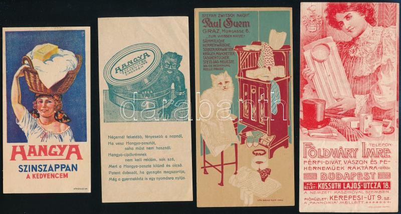 Vegyes számolócédula tétel, 4 db, 2 db Hangya számolócédula, Földváry Imre férfi-divat vászon és fehérnemüek raktára számolócédulája (Bp., Kossuth Lajos utca. 18.), Paul Huem, Graz, osztrák számolócédula, változó állapotban, 15x7 cm és 12x6 cm közötti méretben