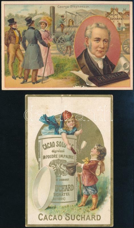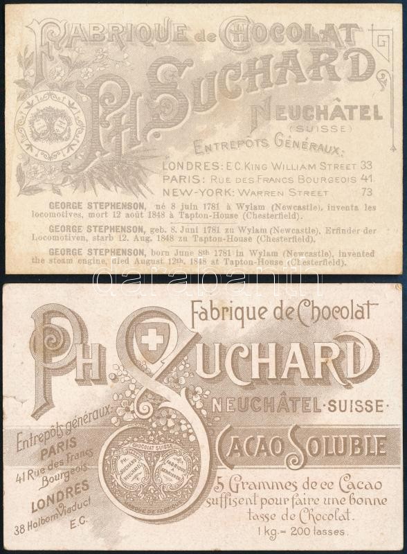 cca 1900 Fabrique de Chocolat Ph Suchard, 2 db Suchard litografált gyűjtői kártya, az egyiken George Stephenson-nal, az egyik foltos, a másikon kis szakadással, 10x7 cm