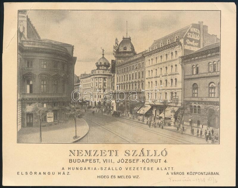 cca 1910-1920 Bp., Nemzeti Szálló (VIII. József-körút 4.) magyar és né... https://www.darabanth.com/hu/389-Gyorsarveres/389.0/Mutargy-papirregiseg-egyeb/Reklam~22/cca-1910-1920-Bp-Nemzeti-Szallo-VIII-Jozsef-korut-4-magyar-es-nemet-nyelven-reklam-ka~II2340667