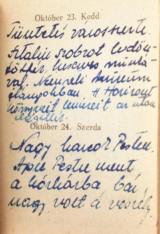 Leírás: 1956 Előjegyzési zsebnaptár október 23-tól naplószerű bejegyzésekkel a forradalom eseményeiről is. Érdekes kordokumentum!