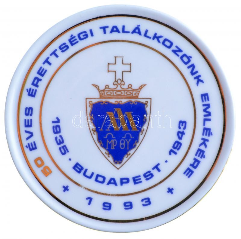 Leírás: 1993. "50 éves érettségi találkozónk emlékére - 1935 - 1943 - Budapest" Piarista Gimnázium jelzett Hollóházi porcelán plakett, erdeti tokban (88mm) T:1