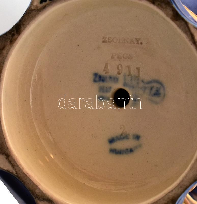 Zsolnay amfora váza udvarlási jelenettel. XIX. sz. vége. Kézzel festett, jelzett (máz alatti kék családi pecsét, benyomott Zsolnay Pécs) sérülésekkel. 32,5 cm