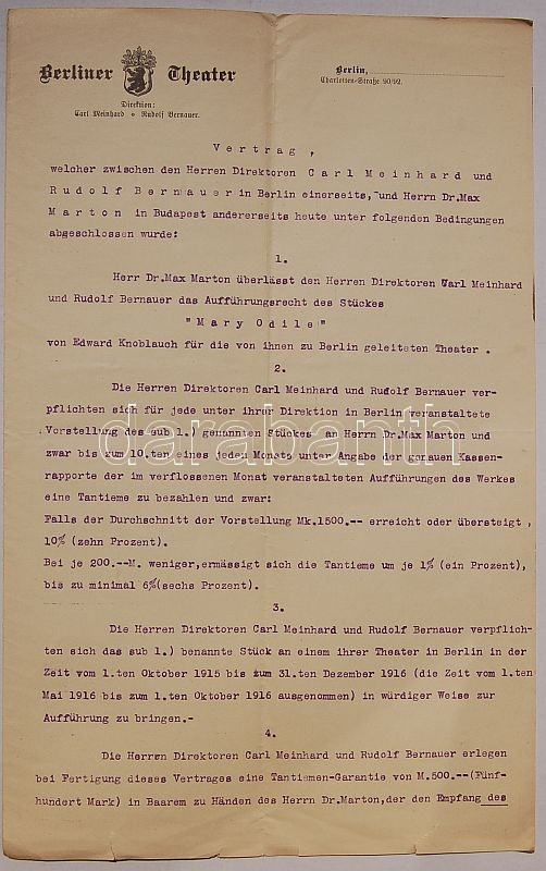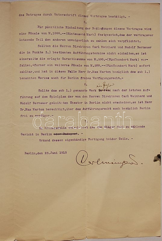 Leírás: Carl Meinhard a berlini színház direktórának aláírása fejléces papírján 1915
