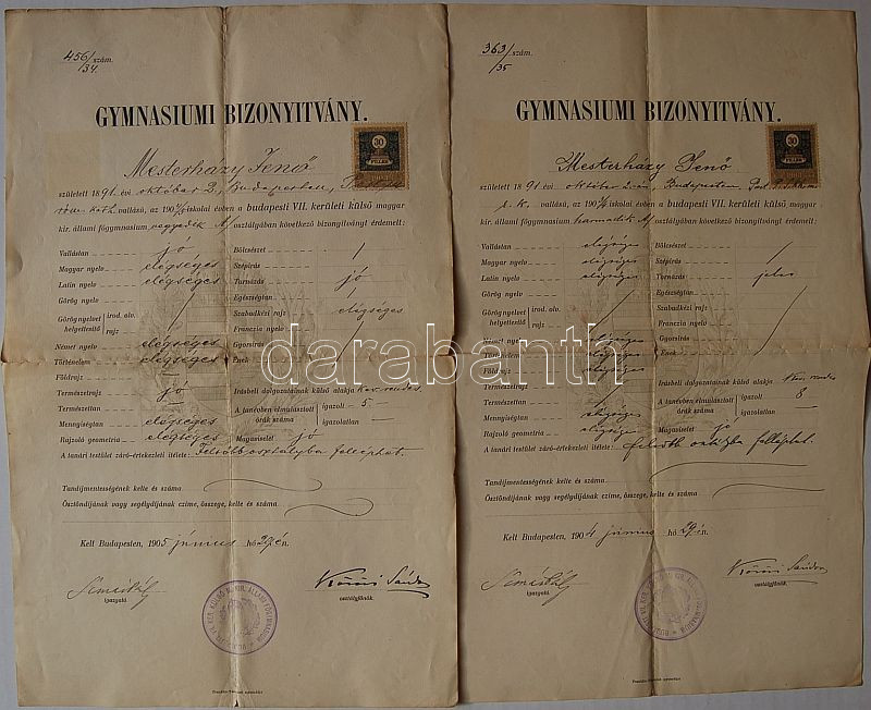 Leírás: 2db gimnáziumi bizonyítvány (1904,1905) 1903 típusó okmánybélyeggel